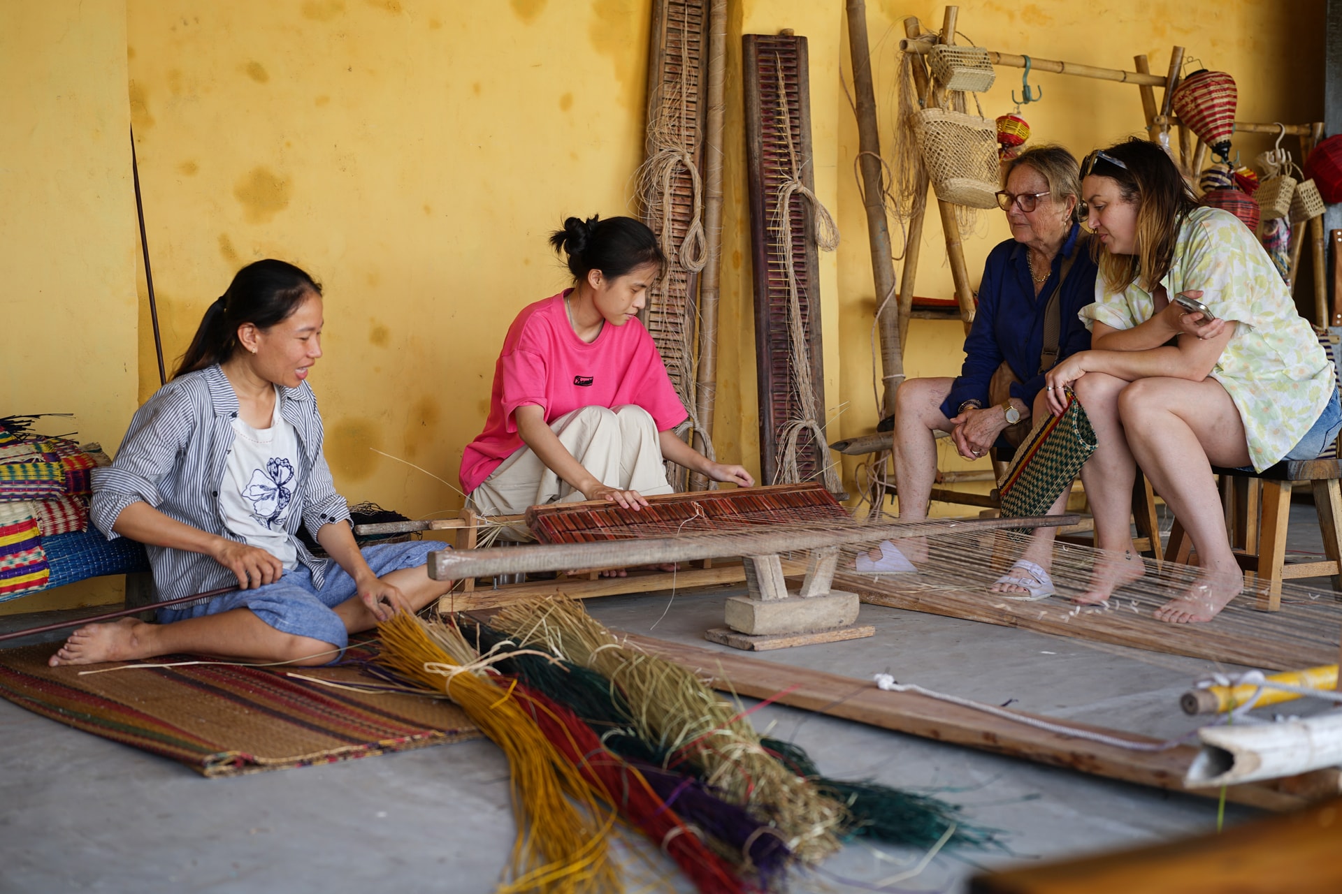 Du khách tìm hiểu nghề dệt chiếu cói truyền thống Kim Bồng. Ảnh: Xuân Sơn
