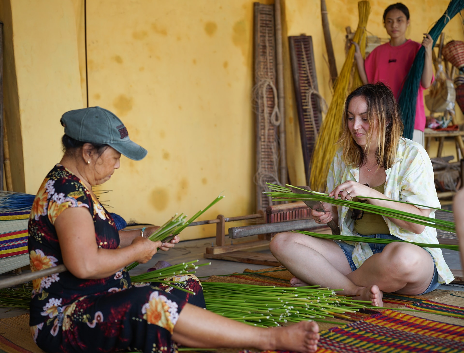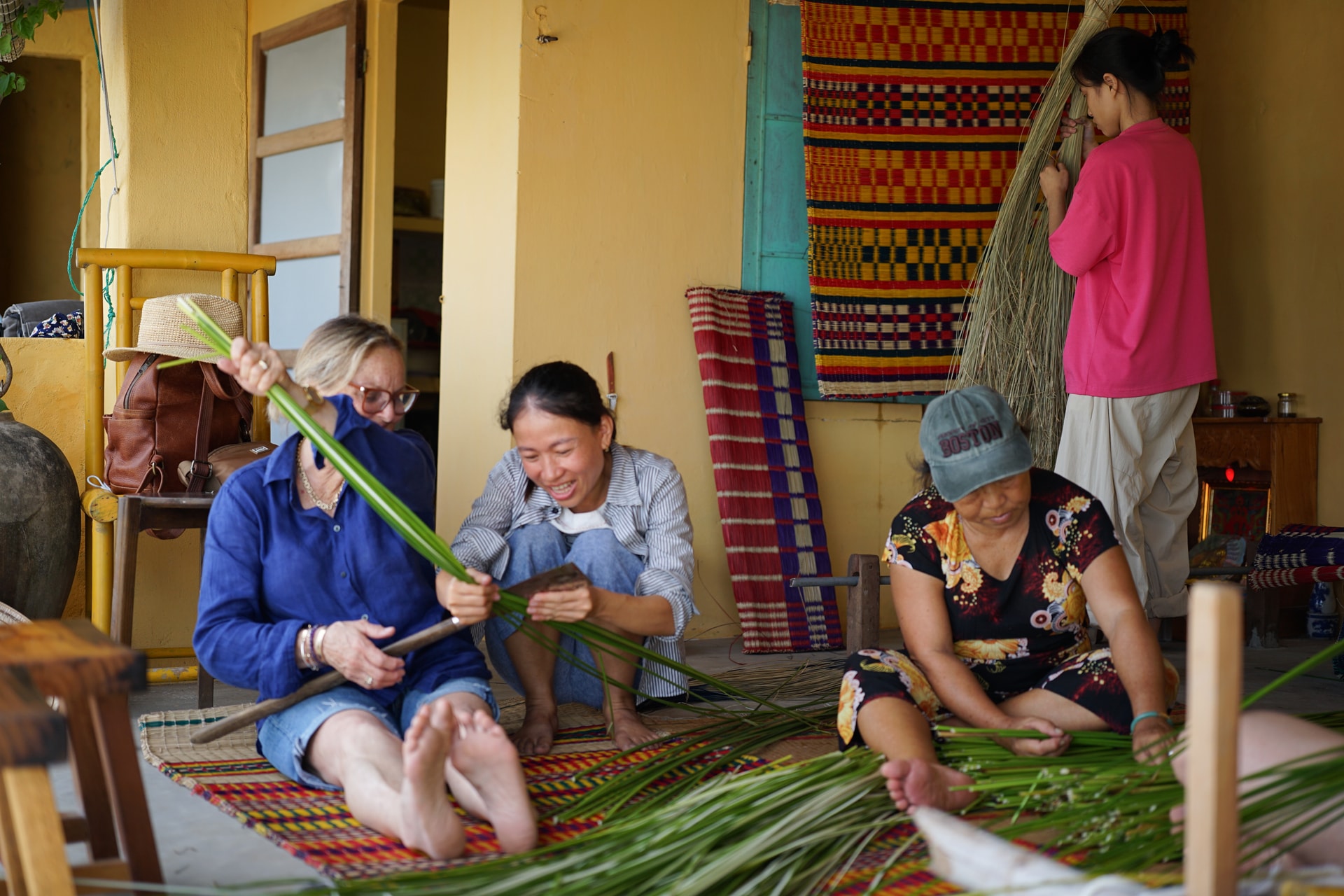 Dưới sự hướng dẫn của người dân địa phương, bà Finn làm quen với việc chẻ cói, phơi cói, chọn màu sắc nhuộm yêu thích và dệt nên tấm chiếu của mình.