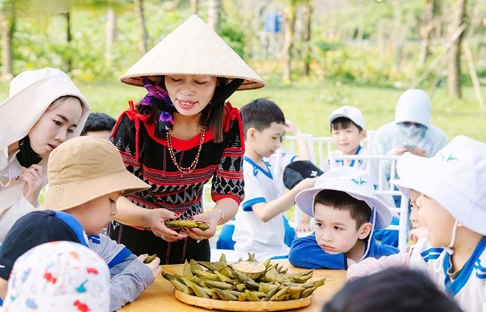 Workshop làm bánh sừng trâu của đồng bào Cơ Tu thu hút nhiều trường học cho học sinh tham gia trải nghiệm.