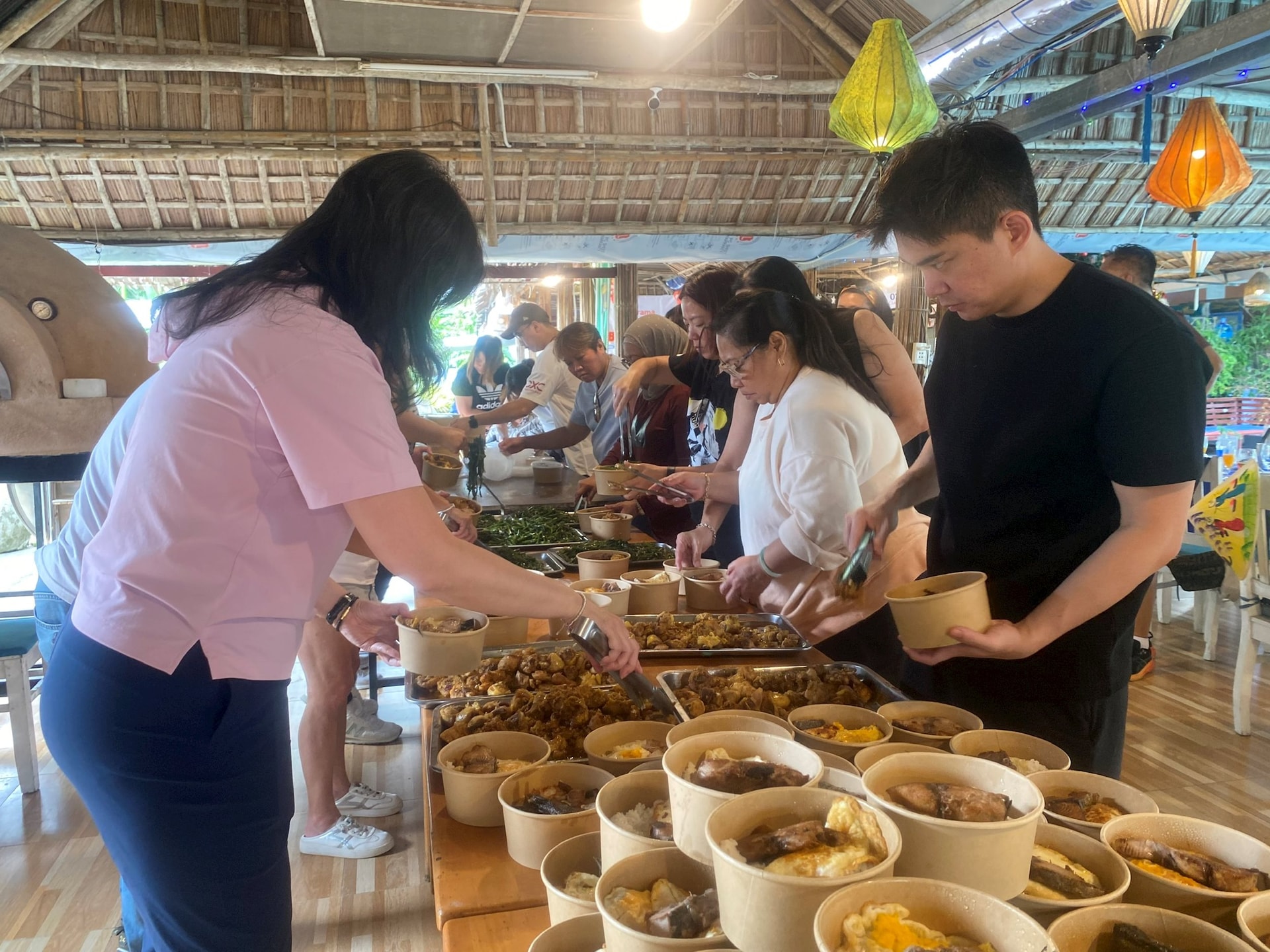 Các du khách Singapore vui vẻ tham gia chương trình “Bữa ăn thiện nguyện - Kết nối yêu thương”. Ảnh: Khánh Linh
