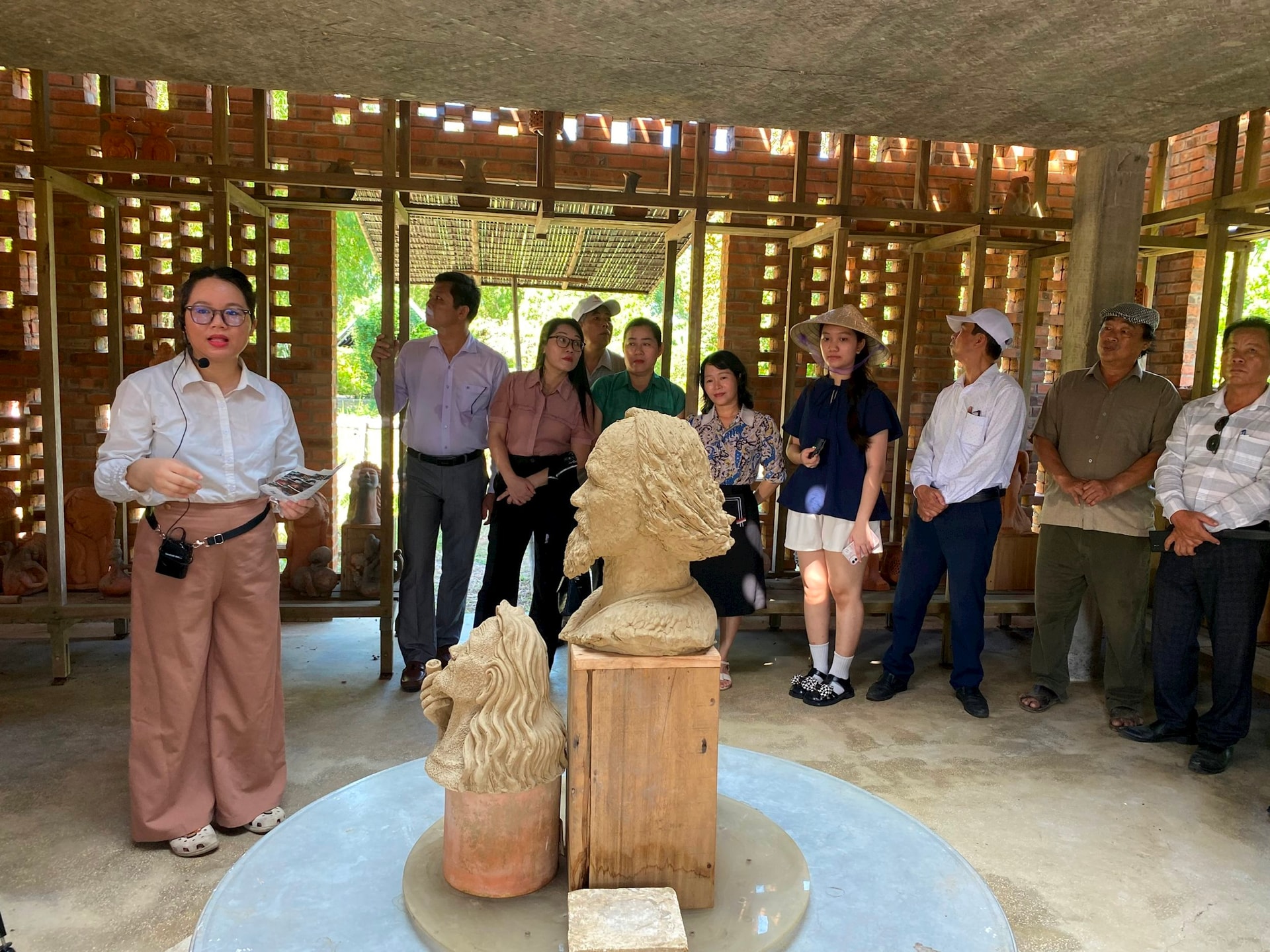 Đoàn famtrip nghe thuyết minh tại xưởng đất nung Terra Cotta Studio của nghệ nhân Lê Đức Hạ, làng Đông Khương, phường Điện Bàn. Ảnh: Q.T