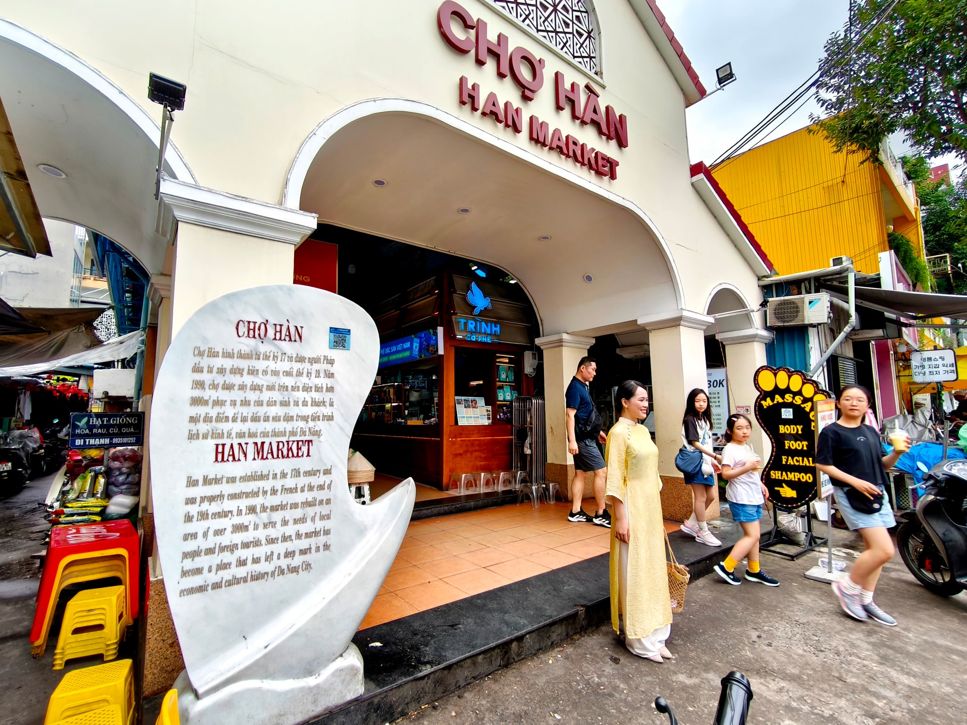 Bia đá song ngữ Việt - Anh, có gắn mã QR giới thiệu về chợ Hàn gây nhiều ấn tượng cho du khách vì tính thẩm mỹ và tiện ích. Ảnh: H.S