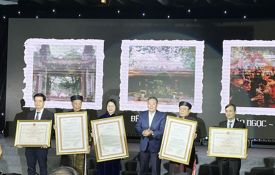 Phó Chủ tịch Thường trực UBND TP. Hà Nội Lê Hồng Sơn trao Quyết định công nhận 03 điểm du lịch cấp Thành phố: Di tích quốc gia đặc biệt đền Quán Thánh, đền Voi Phục và đảo Ngọc - Trúc Bạch và 02 nghề truyền thống của quận Ba Đình (Ảnh: TITC)