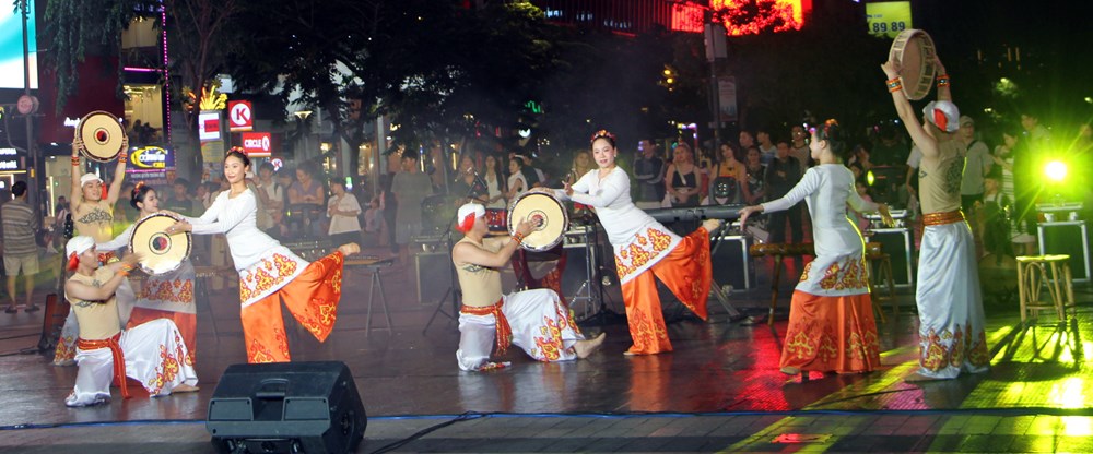Các nghệ sĩ Nhà hát Ca múa nhạc Dân tộc Bông Sen biểu diễn phục vụ tại phố đi bộ Nguyễn Huệ vào buổi tối cuối tuần