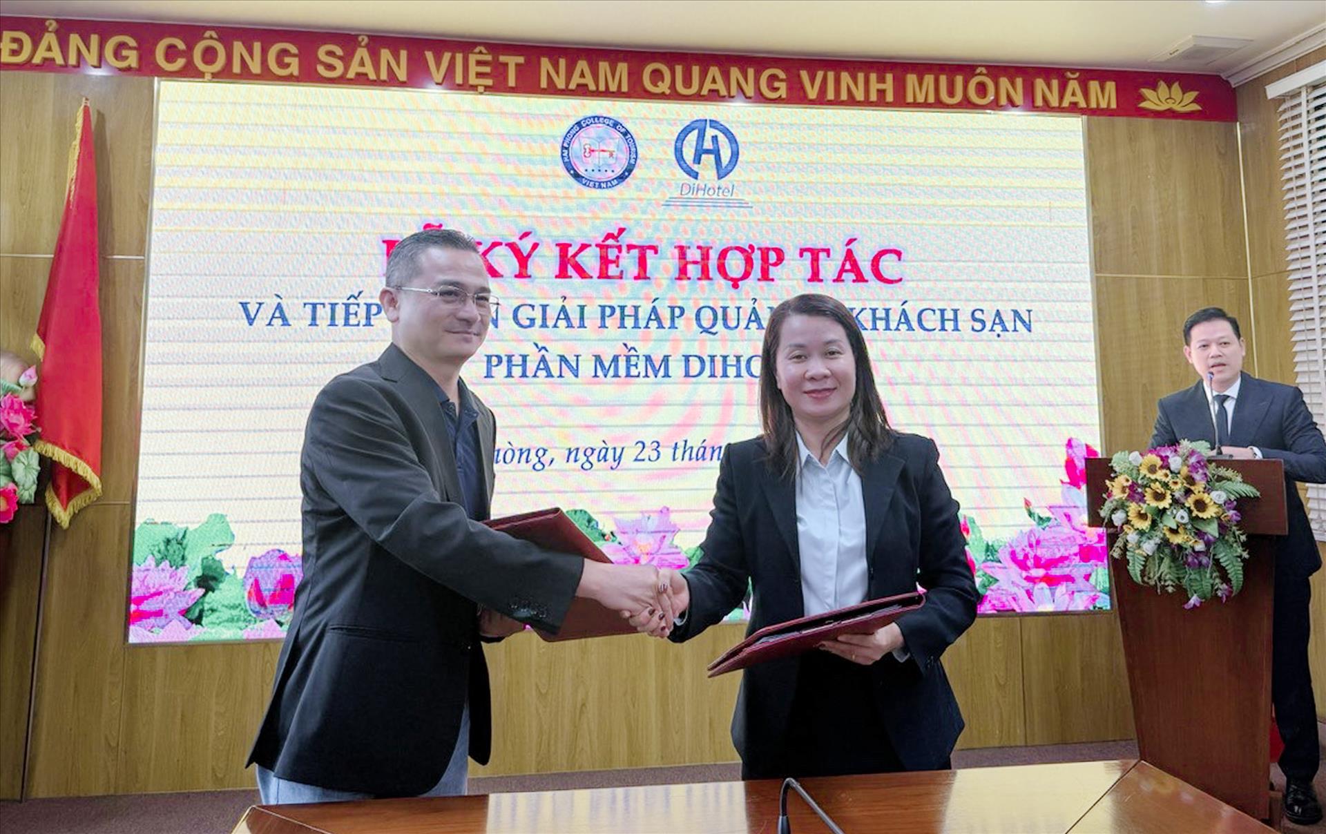 Ông Nguyễn Vĩnh Tâm (trái), Chủ tịch Hội đồng Quản trị Dihotel trao tặng phần mềm cho Phó Hiệu trưởng trường Cao đẳng Du lịch Hải Phòng Nguyễn Thị Hải Hòa