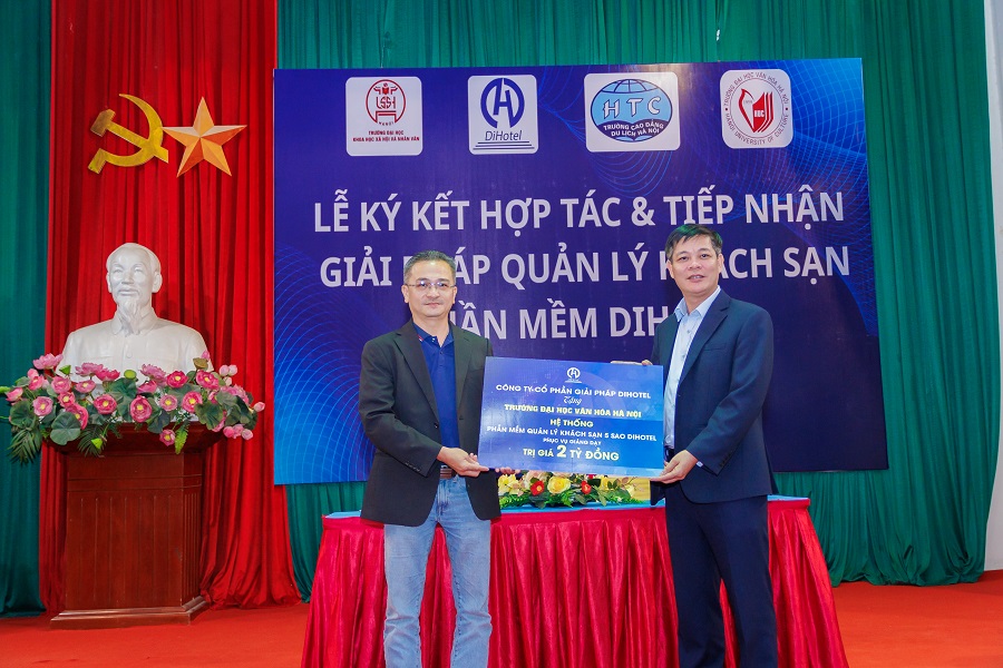 Ông Nguyễn Vĩnh Tâm (trái), Chủ tịch Hội đồng Quản trị Dihotel trao tặng phần mềm cho trường Đại học Văn hoá Hà Nội