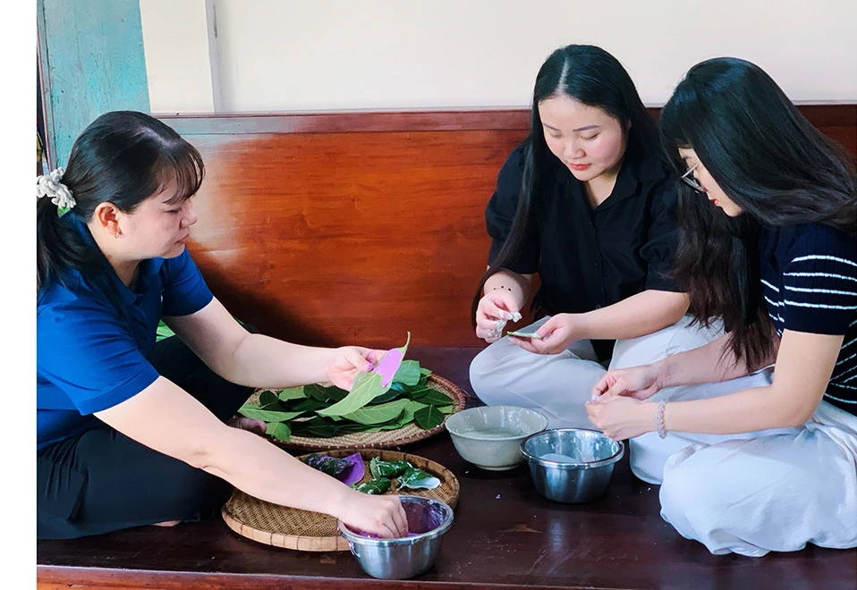 Du khách trải nghiệm làm bánh lá mít tam sắc.