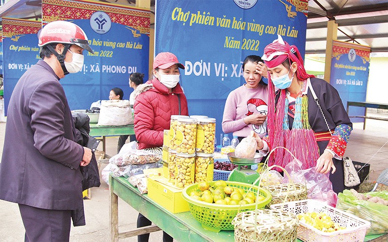 Chị Triệu Tài Múi với bộ trang phục Dao truyền thống đang giới thiệu các sản phẩm truyền thống của xã, vui vẻ cho biết: Sau hai năm phải tạm dừng do dịch Covid-19, chị rất háo hức tới chợ phiên và các lễ hội trên địa bàn, vừa là để trao đổi, giao lưu hàng hóa cũng như giao lưu văn hóa giữa các dân tộc.