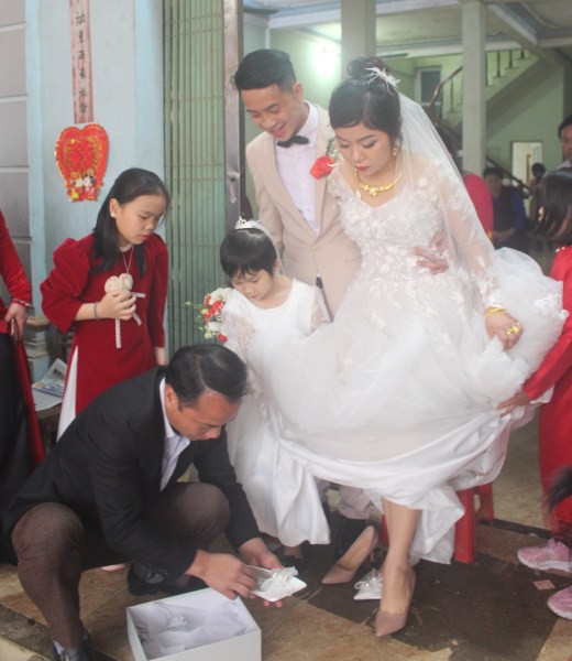 Khi cô dâu bước ra cửa thì người cha hoặc chú, bác ruột sẽ đi giày mới cho cô dâu. Ở đây, người Tày quan niệm rằng, khi bố đi giày cho con gái chính là lúc người con phải tự đi vững trên đôi chân của mình, đây là giây phút thiêng liêng của mỗi cô dâu khi bước ra cửa. Khoảnh khắc người cha đi giày cho con gái như gửi gắm niềm mong mỏi của của mình đến với tương lai, mong con gái từ nay sẽ trưởng thành, cùng chồng chăm lo cho gia đình riêng và sống vui vẻ, hạnh phúc.