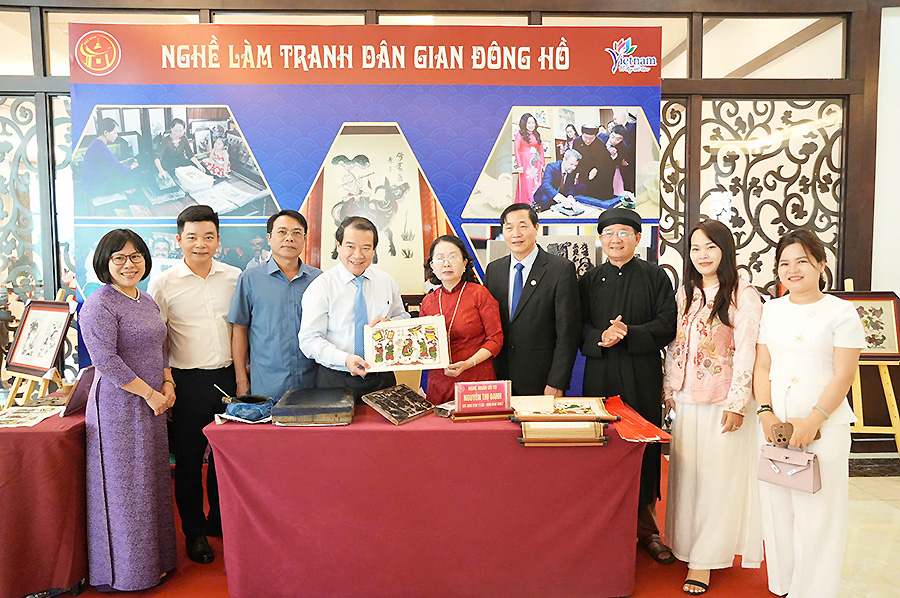 Bên lề Hội nghị, Phó Cục trưởng Hà Văn Siêu tham quan không gian trưng bày, trình diễn nghề làm tranh Đông Hồ (Ảnh: BTC)