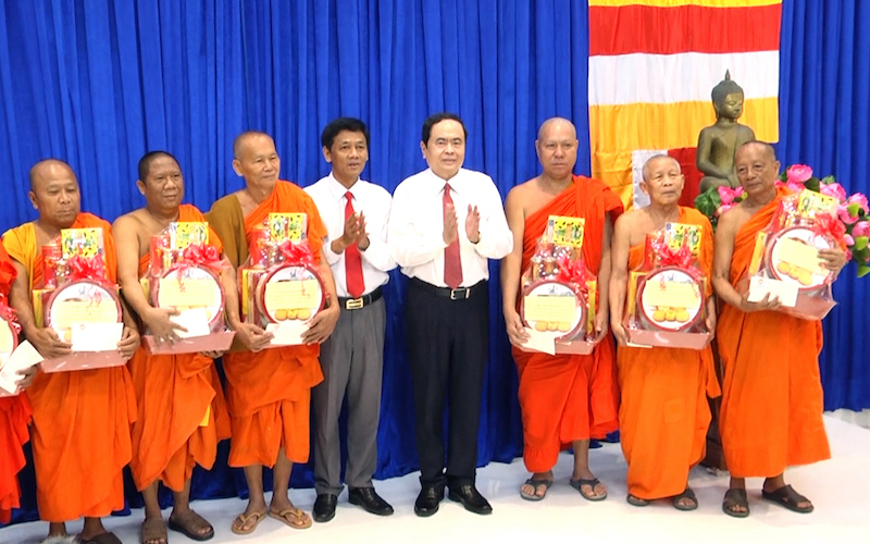 Đồng chí Trần Thanh Mẫn và lãnh đạo Tỉnh ủy Sóc Trăng tặng quà cho các vị sư lãnh đạo Hội Đoàn kết sư sãi yêu nước tỉnh Sóc Trăng.