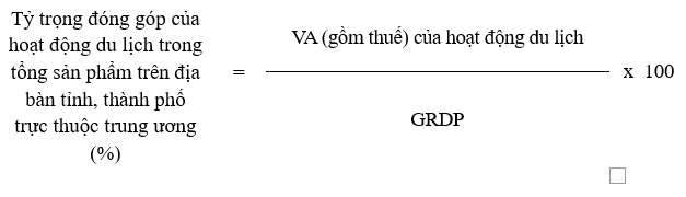 Đo lường đóng góp của hoạt động du lịch trong tăng trưởng kinh tế của địa phương sẽ được lượng hóa qua chỉ tiêu thống kê “Tỷ trọng đóng góp của hoạt động du lịch trong tổng sản phẩm trên địa bàn tỉnh, thành phố trực thuộc trung ương”. Công thức tính là:
