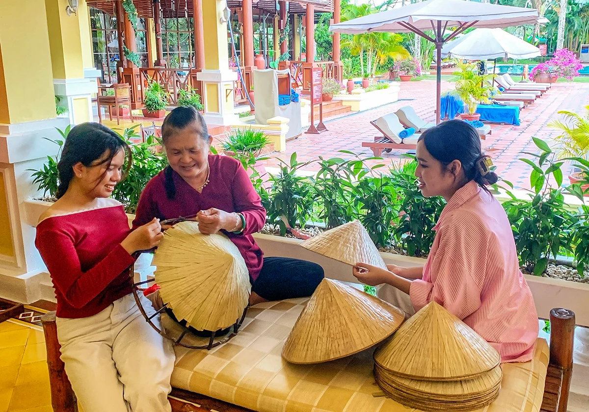 Du khách trải nghiệm chằm nón ở Khách sạn Victoria Cần Thơ.