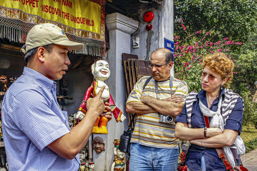Du khách quốc tế tìm hiểu về nhân vật rối nước. Ảnh: Nguyễn Huỳnh Mai