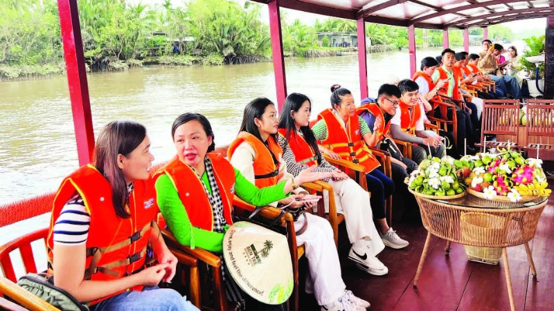 Du khách tham quan bằng tàu du lịch dọc dòng sông Thom (xã Mỏ Cày, tỉnh Vĩnh Long).