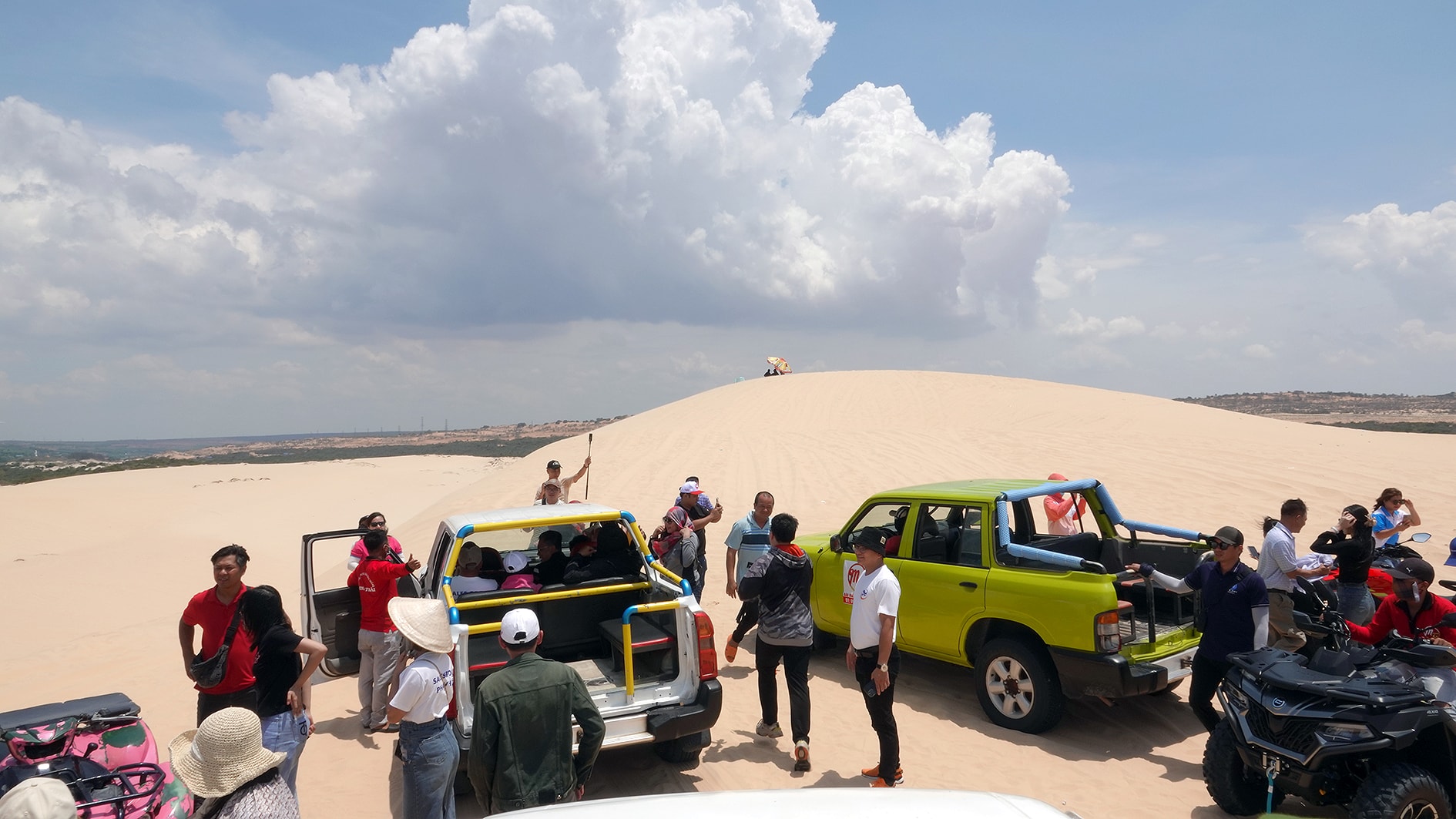 Khách du lịch trải nghiệm trên đồi cát Bàu Trắng. Ảnh: Ngọc Lân