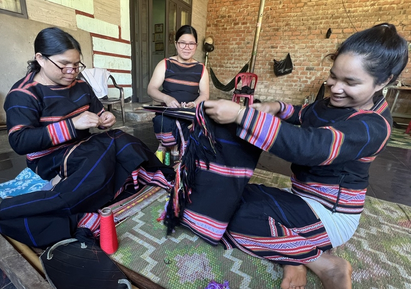 Bà Yứt (ở giữa)-Tổ trưởng Tổ hợp tác dệt thổ cẩm làng Chuét Ngol cùng chị em dệt thổ cẩm để bán - Ảnh: Đ.Y