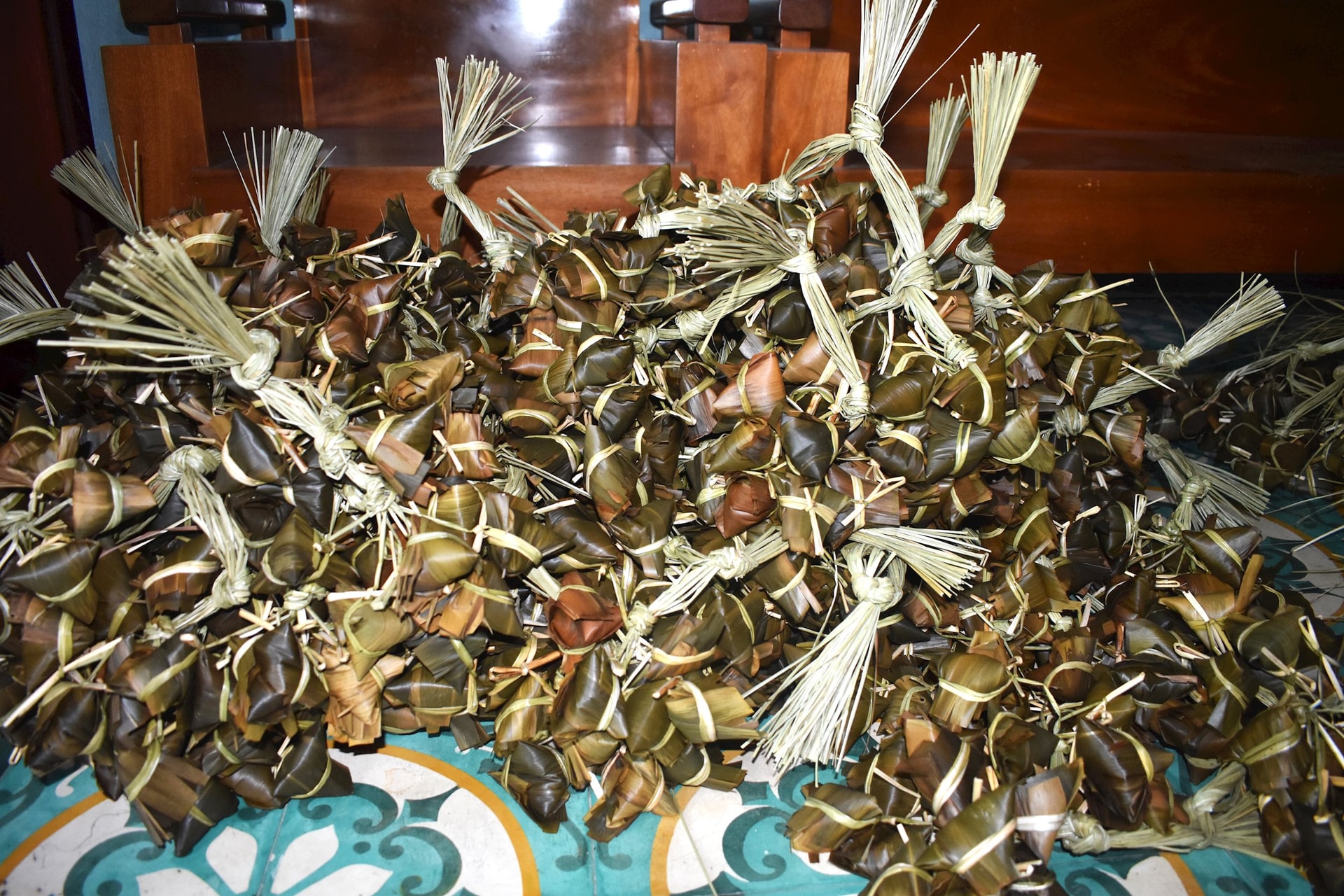 Những chiếc bánh ú tro được buộc dây khá cẩn thận để khi hấp không thấm nước. Ảnh: Nguyễn Quỳnh