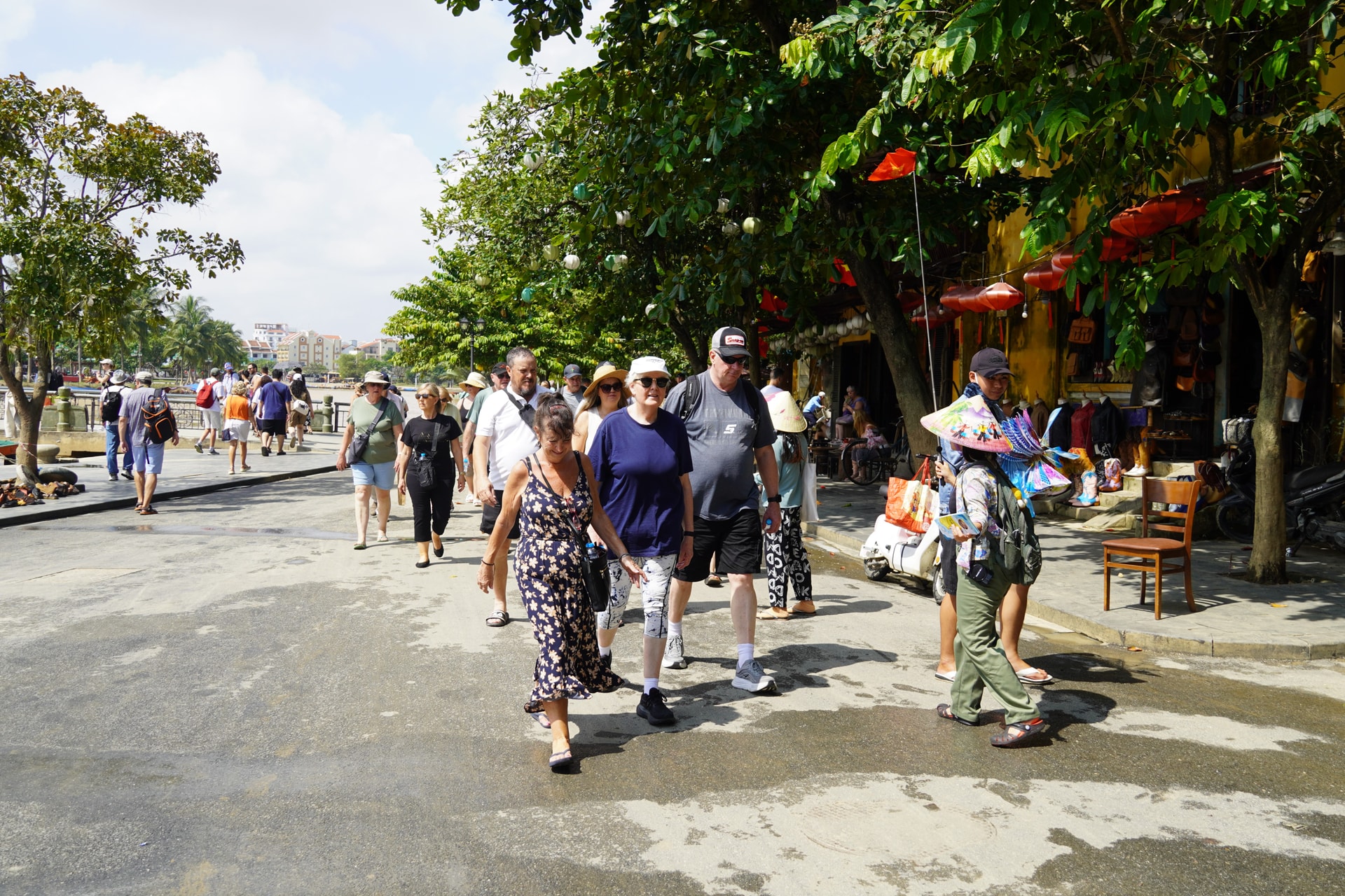 Du khách thích thú dạo bước trên đường Bạch Đằng để ngắm sông Hoài. Ảnh: Tấn Châu