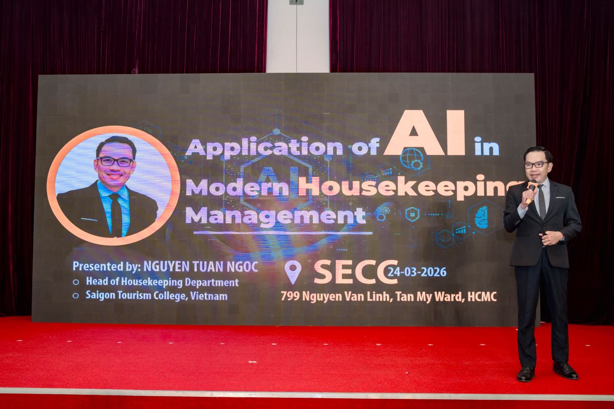 Một trong những nội dung thu hút nhiều sự quan tâm tại hội thảo là việc ứng dụng trí tuệ nhân tạo (AI) trong quản lý buồng phòng. Ông Nguyễn Tuấn Ngọc, Trưởng bộ môn Housekeeping Trường Cao đẳng Du lịch Sài Gòn, đã trình bày cách sử dụng ChatGPT để tối ưu hóa quy trình công việc, từ phân công nhiệm vụ đến chuẩn hóa vận hành. Theo ông, AI không chỉ hỗ trợ xử lý văn bản mà còn mở rộng sang quản lý dự án với các tính năng chuyên sâu, giúp kiểm soát hiệu quả khối lượng công việc lớn của bộ phận buồng phòng, đảm bảo vận hành trơn tru và đồng bộ. Bên cạnh đó, AI còn trở thành công cụ hữu ích trong đào tạo nhân sự. Việc kết hợp các nền tảng như ChatGPT, Google Gemini và Canva cho phép xây dựng kịch bản video, thiết kế bài giảng trực quan và tạo câu hỏi trắc nghiệm một cách nhanh chóng, góp phần nâng cao chất lượng đào tạo và giúp nhân viên dễ dàng tiếp cận kiến thức.