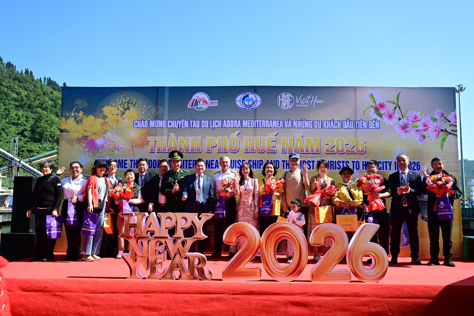 Niềm vui tiếp tục lan tỏa đến Cảng Chân Mây vào lúc 12h00 cùng ngày khi siêu tàu du lịch Adora Mediterranea (quốc tịch Bahamas) chính thức cập bến, mang theo 2.680 hành khách và 920 thuyền viên, chủ yếu từ thị trường Trung Quốc và Hong Kong. Buổi lễ đón tiếp tại cảng biển diễn ra vô cùng chu đáo với các tiết mục nghệ thuật đặc sắc. Trong số hàng ngàn du khách cập cảng, hơn 1.000 khách đã đăng ký các tour tham quan, khám phá vẻ đẹp di sản của Huế và Đà Nẵng, hứa hẹn một ngày trải nghiệm đầy thú vị tại miền Trung Việt Nam.