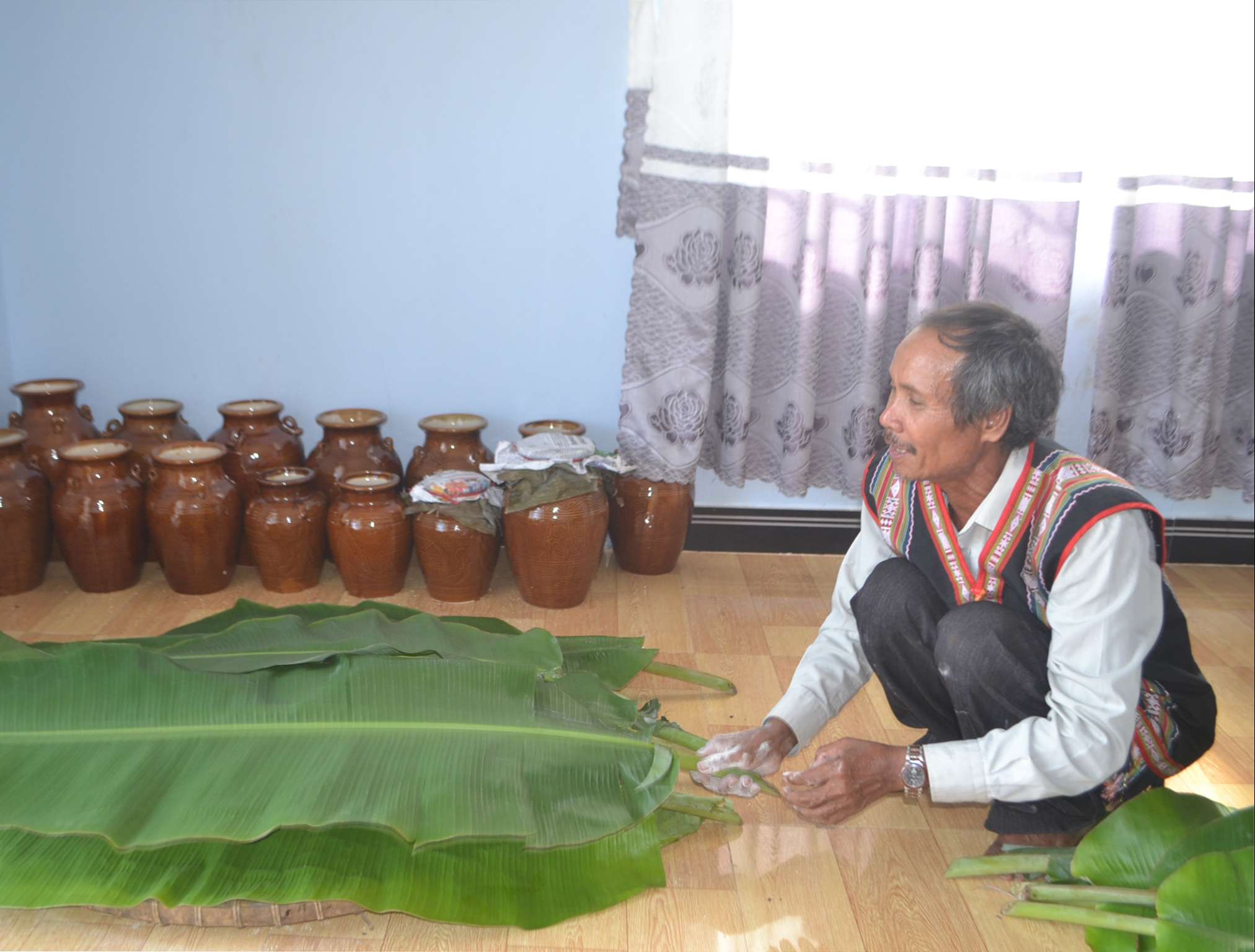 Ông Nai Buih ủ cơm nếp đã trộn bột men bằng nhiều lớp lá chuối. Ảnh: V.N