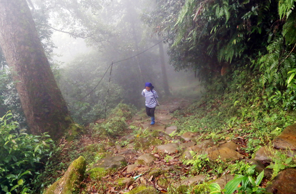 Khi tôi đến đầu thôn Lao Chải 1, trưởng thôn người Hà Nhì tên Chu Che Xá đã đợi ở đó. Theo chân Xá, chúng tôi xuôi xuống con dốc, đi chừng 10 phút thì gặp đoạn đường rộng chừng 3 gang tay người lớn, nền đường được lát bởi những phiến đá phẳng. Có đoạn đường rộng hơn được lát bằng những phiến đá to, mặt đá nhẵn thín, nổi vân ngang dọc. Qua đoạn giáp với ruộng bậc thang, con đường nhỏ xuyên vào rừng cây cổ thụ ẩm ướt, sương mù giăng kín lối, có gốc cây to mấy người ôm, thân đầy rêu mốc. Ở đoạn này đường dốc hơn, những phiến đá bám đầy rêu trơn trượt được xếp thành bậc thang rất chắc chắn, nhưng nếu bước không cẩn thận có thể bị trượt chân ngã ngay.