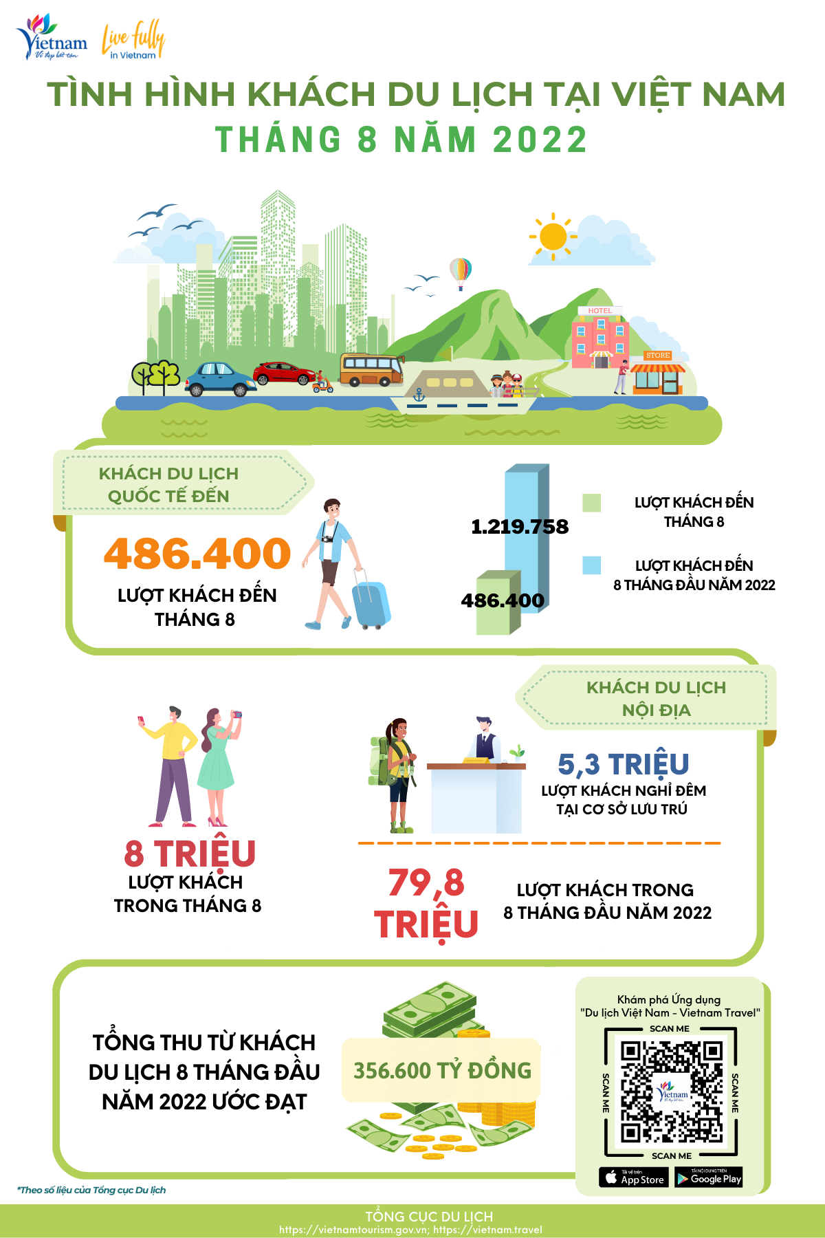 [Infographic] Tình hình khách du lịch tháng 8 và 8 tháng đầu năm 2022Cập nhật: 30/08/2022 08:03:04Số lần đọc: 1383 (TITC) - Dưới đây là Infographic về tình hình khách du lịch tháng 8 và 8 tháng đầu năm 2022. Trung tâm Thông tin du lịch Từ khóa: Infographic, khách du lịch, tháng 8, 8 tháng đầu năm,