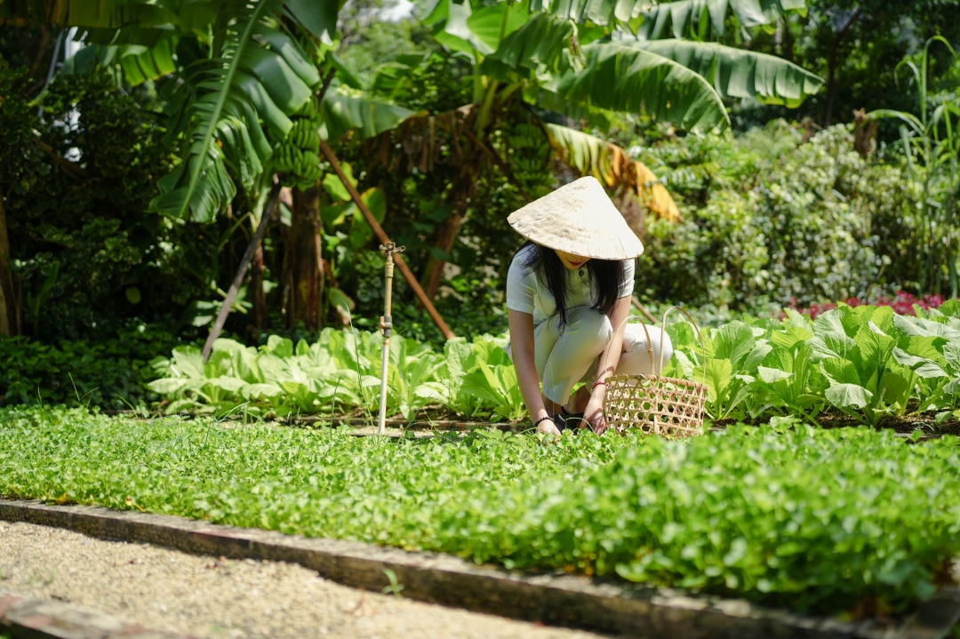 Du khách trải nghiệm chăm sóc vườn rau ở Alma resort.