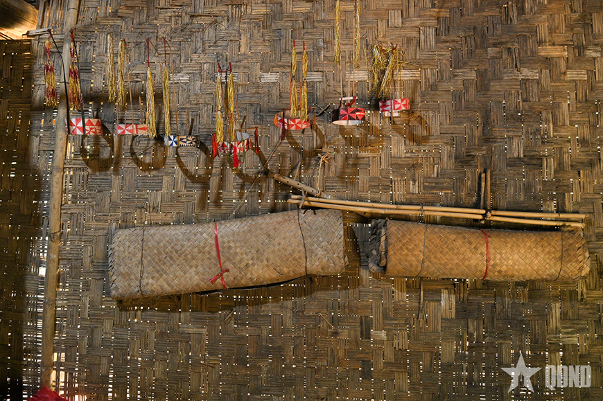 Không gian nhà chia ba phần: Phía Đông cho cha mẹ, phía Tây cho con cái, chính giữa là “phòng khách” tiếp khách quý bằng chiếu trải, rượu cần. Bếp lửa đặt cách xa cầu thang, giữ an toàn. Bà Ngọc chia sẻ thêm: “Còn một nét đẹp độc đáo trong kiến trúc của nhà sàn, đó là “nhà chồ” - gian ló ra trước cửa chính giữa - tạo hình chữ T, không vách, hướng Nam đón gió, nơi phụ nữ giã gạo, gia đình hóng mát. Nhưng tiếc là ở đây vẫn chưa tái hiện được hết”. Cầu thang chính diện dẫn qua nhà chồ vào gian giữa, tiện lợi mà riêng tư. Nhà sàn thường có 6 gian, tăng giảm tùy số người, thành “nhà dài” nếu đông đúc.