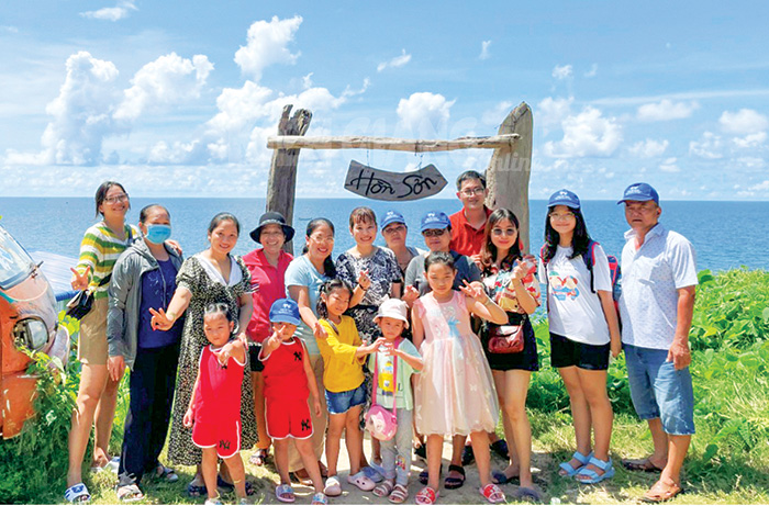 Du khách chụp ảnh lưu niệm tại Hòn Sơn, huyện Kiên Hải (Kiên Giang).