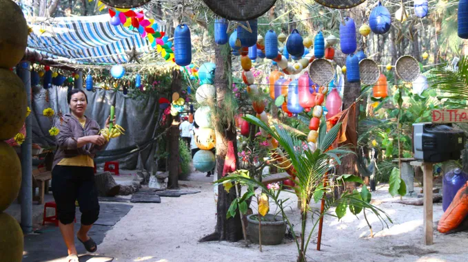 Từ đảo lớn Phú Quý, chúng tôi tiếp tục di chuyển bằng ca nô ra đảo nhỏ Hòn Tranh (thuộc đặc khu Phú Quý) để tìm đến khu vườn sinh thái mang tên “Chị Bảy” của chị Tạ Thị Kim Phôn. Men theo lối mòn nhỏ xuyên qua rừng phi lao, điểm đến dần hiện ra trước mắt với diện mạo đầy bất ngờ. Cả không gian được phủ bởi những dải màu rực rỡ, tạo cảm giác như một “cầu vồng” treo lơ lửng giữa biển trời. Hàng trăm, thậm chí hàng ngàn chiếc phao nhựa đủ sắc màu được kết lại, đung đưa trong gió. Xen kẽ là chai nhựa, dây thừng cũ, gỗ mục, cành cây…, tất cả được sắp đặt ngẫu hứng nhưng tạo nên một tổng thể vừa hài hòa, vừa cuốn hút.