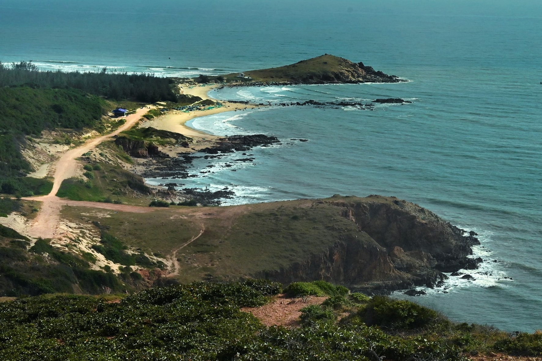 Giữa 2 ngọn đồi vươn ra biển là bãi cát trắng mịn uốn cong như cung tên
