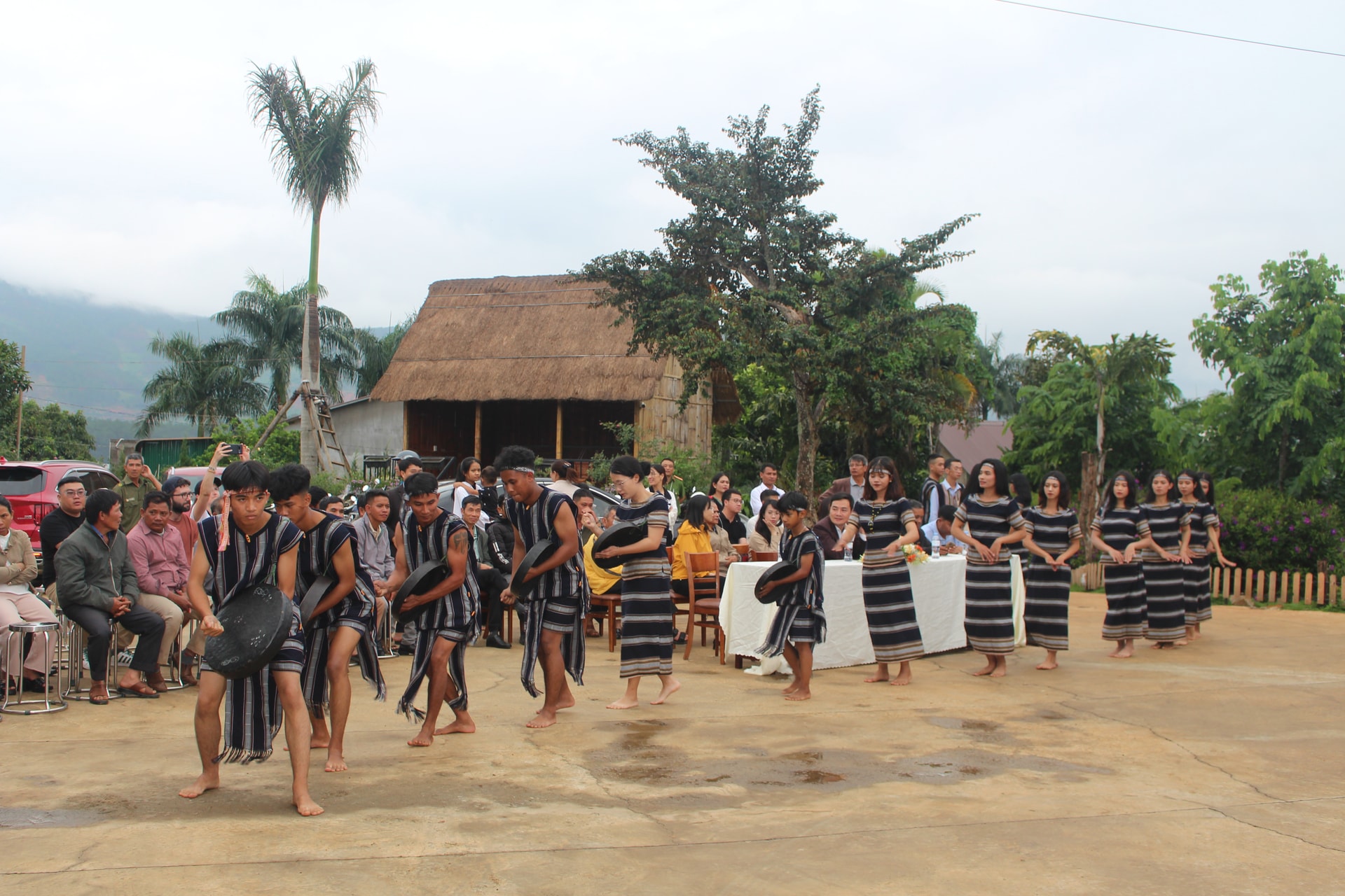 Du khách xem biểu diễn cồng chiêng ở Làng K’ho Cil lúc chiều muộn