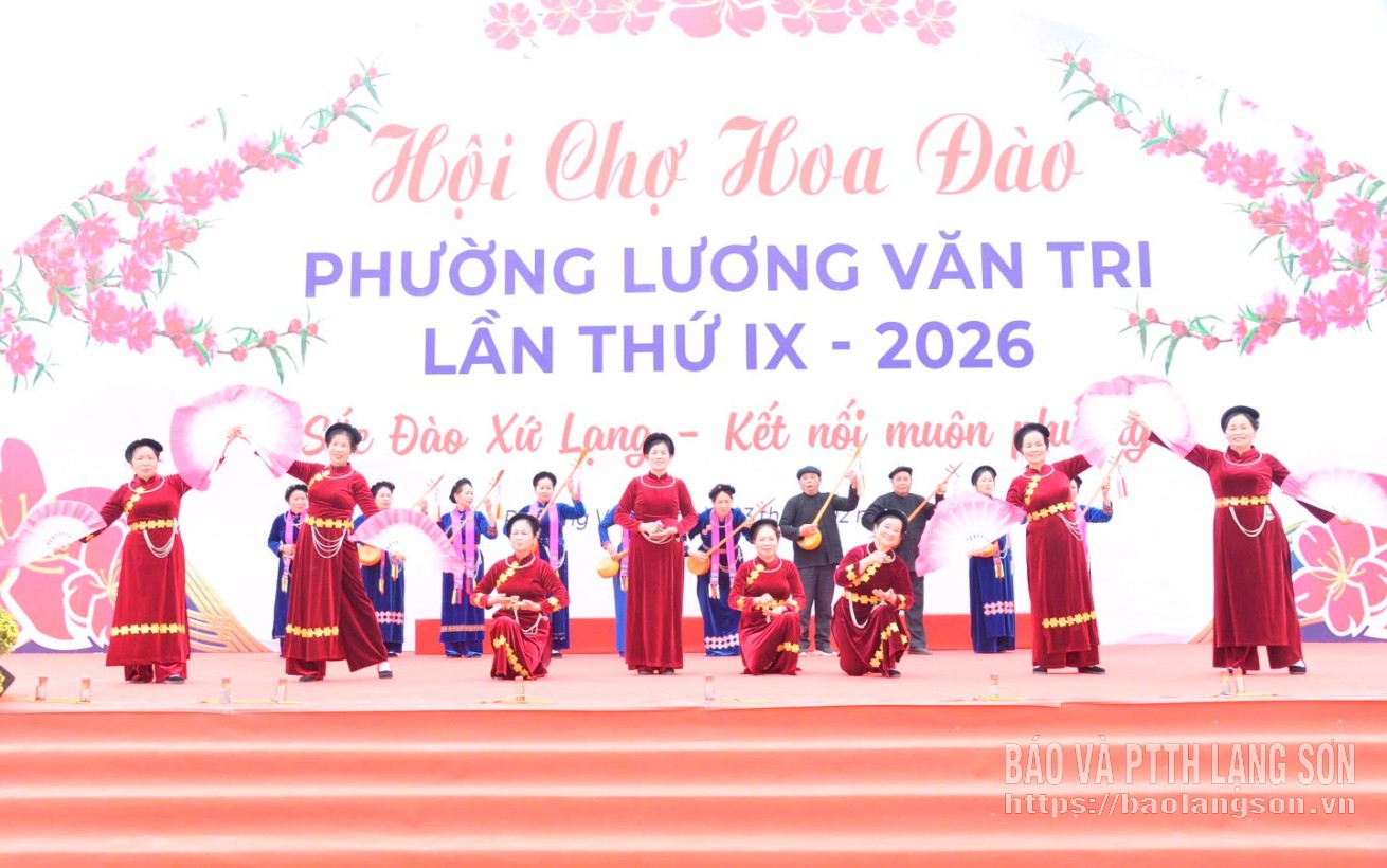 Người dân trên địa bàn phường Lương Văn Tri biểu diễn múa chầu và các điệu hát then, đàn tính tại hội chợ hoa đào năm 2026