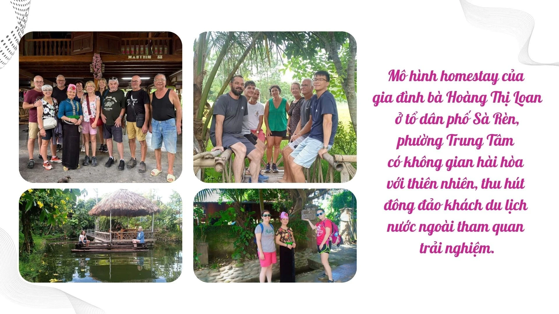 Tại phường Trung Tâm, mô hình homestay của gia đình bà Hoàng Thị Loan ở tổ dân phố Sà Rèn có 2 căn nhà sàn 15 gian, cơ sở có thể phục vụ 30 - 40 khách lưu trú và 60 - 80 khách ăn uống. Không gian được đầu tư hài hòa với thiên nhiên, kết hợp các hoạt động trải nghiệm văn hóa như múa xòe, trình diễn nhạc cụ dân tộc, tham quan bản làng.