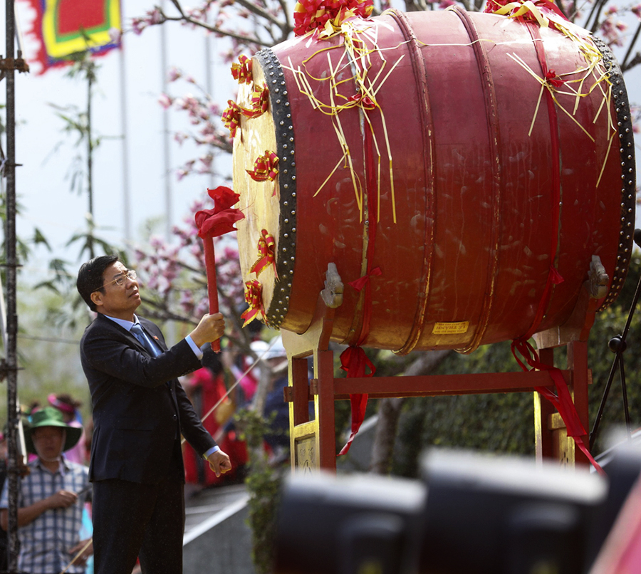 Bí thư Tỉnh ủy Bắc Giang Dương Văn Thái đánh trống khai hội. Ảnh: Báo Bắc Giang