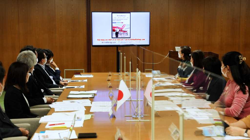 Đại diện Cảng HKQT Vân Đồn giới thiệu dịch vụ của doanh nghiệp tại buổi làm việc với các cơ quan chức năng và doanh nghiệp lữ hành của tỉnh Hokkaido (tháng 9/2022).