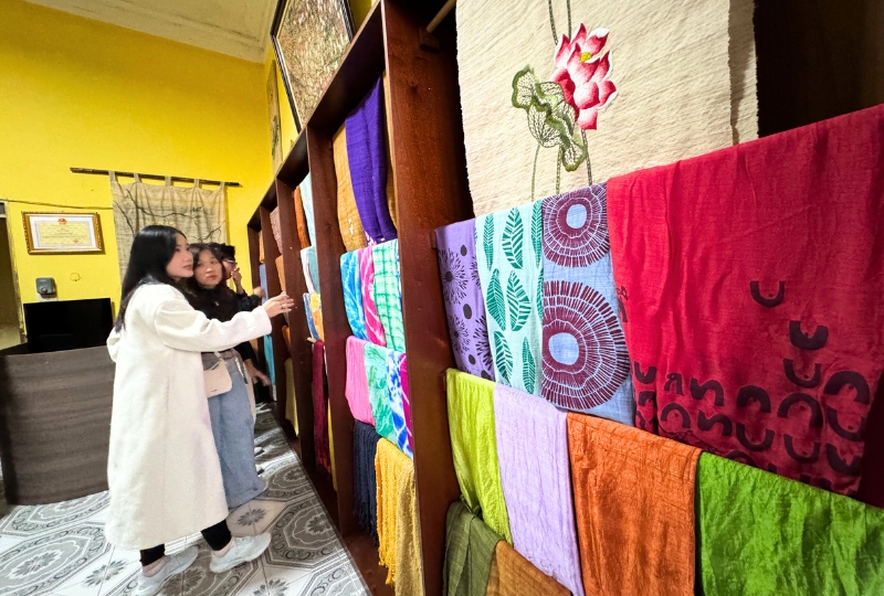 Trải nghiệm được yêu thích nhất là tự tay kéo sợi, dệt lụa và nhuộm khăn. Trải nghiệm nhuộm khăn đòi hỏi sự tinh tế khi thả màu trên mặt nước, tạo ra những họa tiết độc đáo mang dấu ấn cá nhân. Nhờ vậy, du khách hiểu hơn về sự cầu kỳ của nghề, trân trọng hơn giá trị của từng tấm lụa.