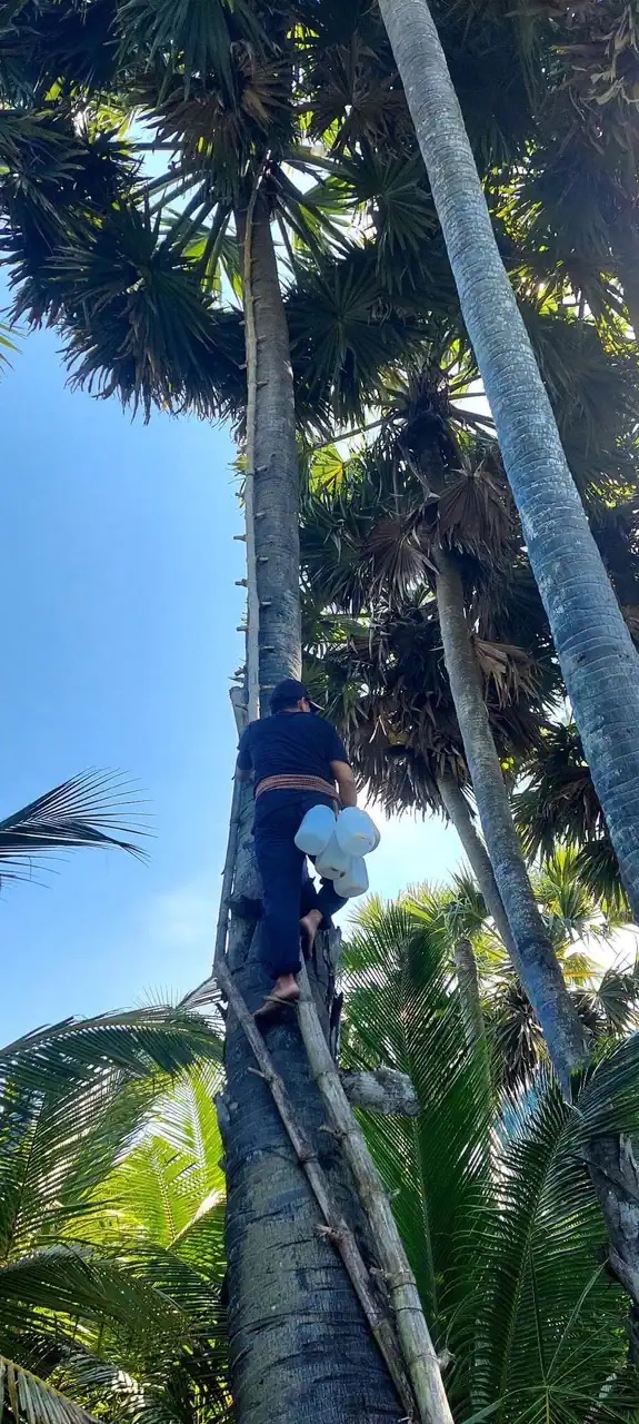 Bà con Khmer An Giang thu hoạch nước thốt nốt, nguyên liệu chính dùng làm đường thốt nốt. Ảnh: Duy Khôi