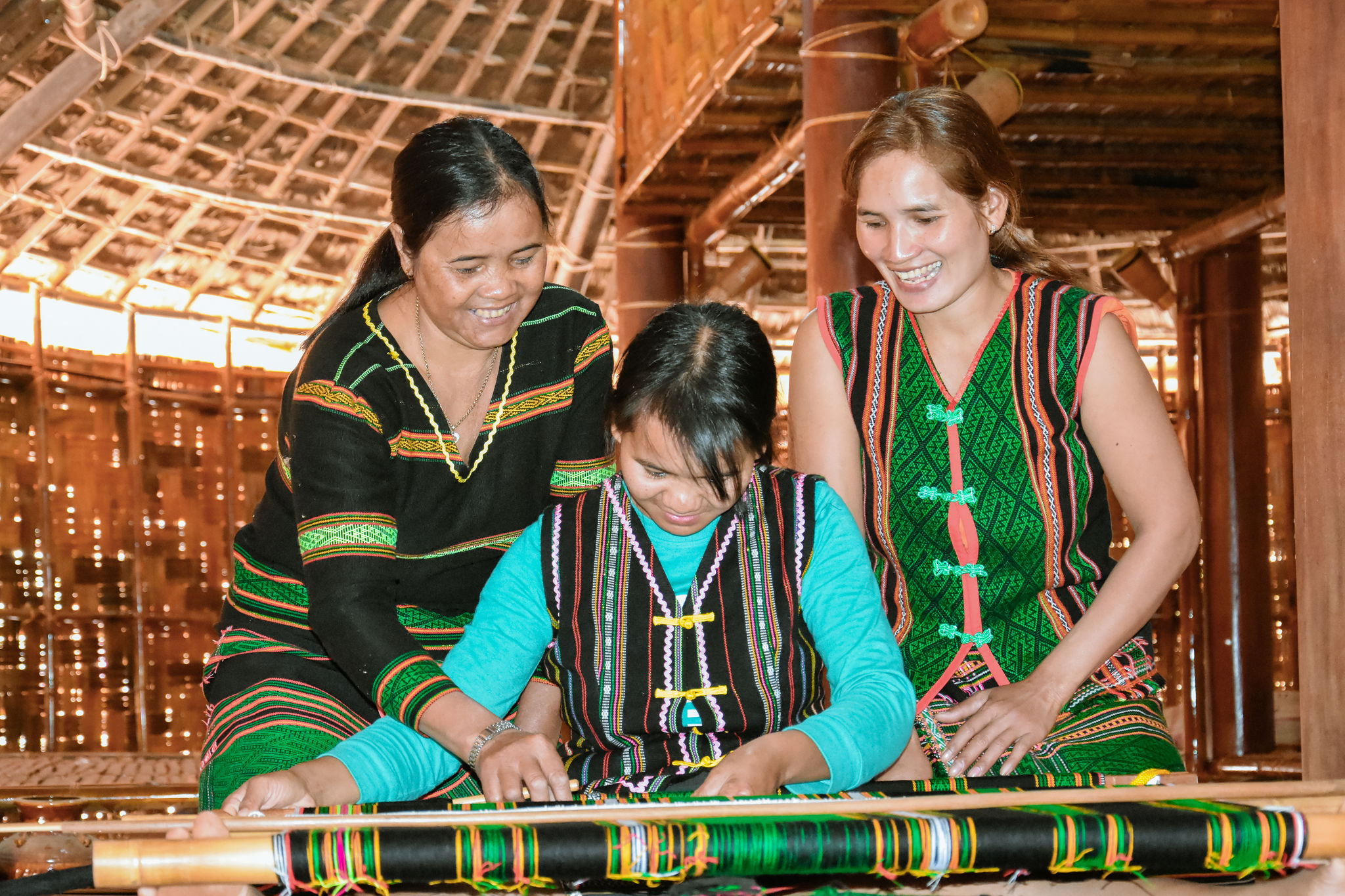 Bà Thị D’Jê cùng các con bên khung cửi, dệt nên những tấm thổ cẩm mang đậm bản sắc văn hóa M’nông