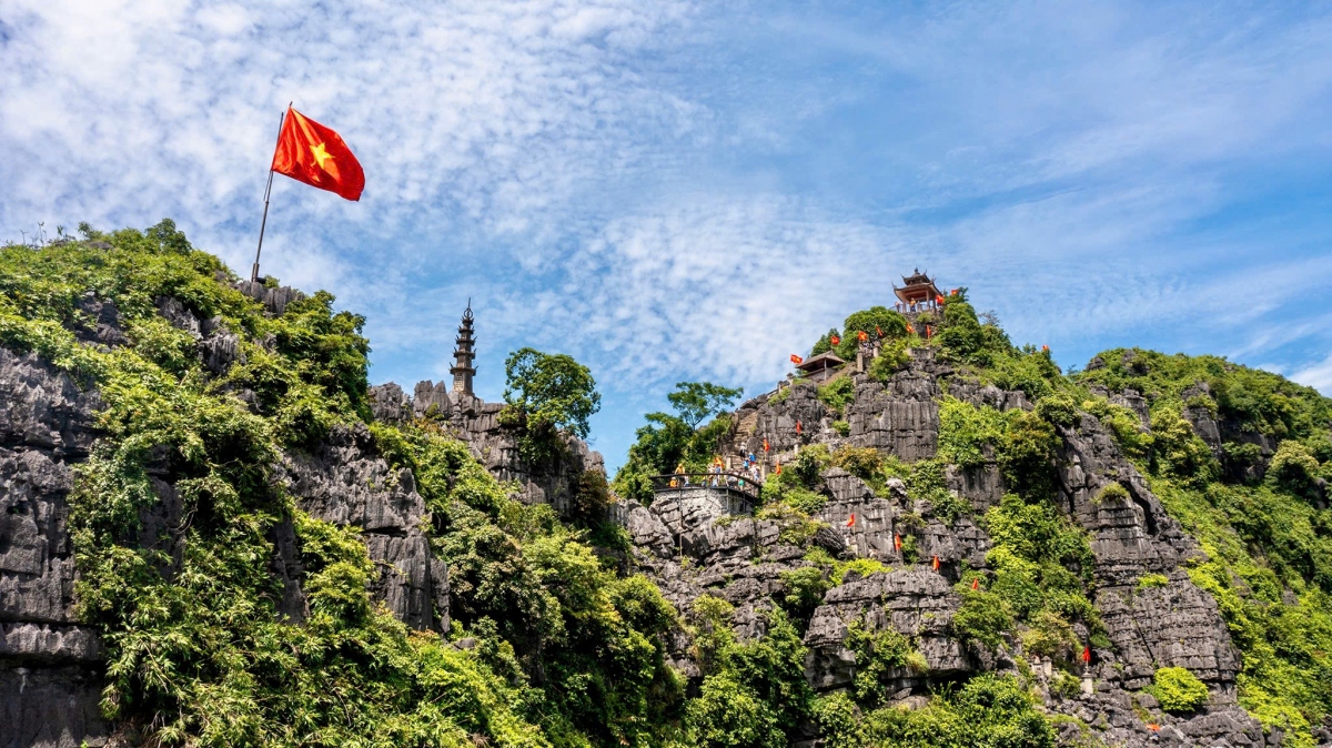 Khi trend cờ Tổ quốc đang rất hot thì “đệ nhất check in Ninh Bình” là Hang Múa cũng ngập tràn những lá cờ đỏ sao vàng được cắm từ trên đỉnh Ngọa Long cho tới dọc đường leo lên trên đỉnh núi.