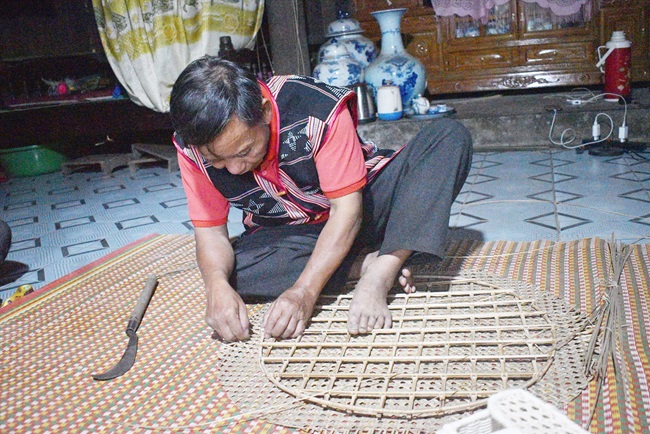 Ông Bhling Blóo ở thôn Bhơ Hôồng, xã Sông Kôn ngồi đan chiếc mâm cơm bằng mây tre. Ảnh: N.Q