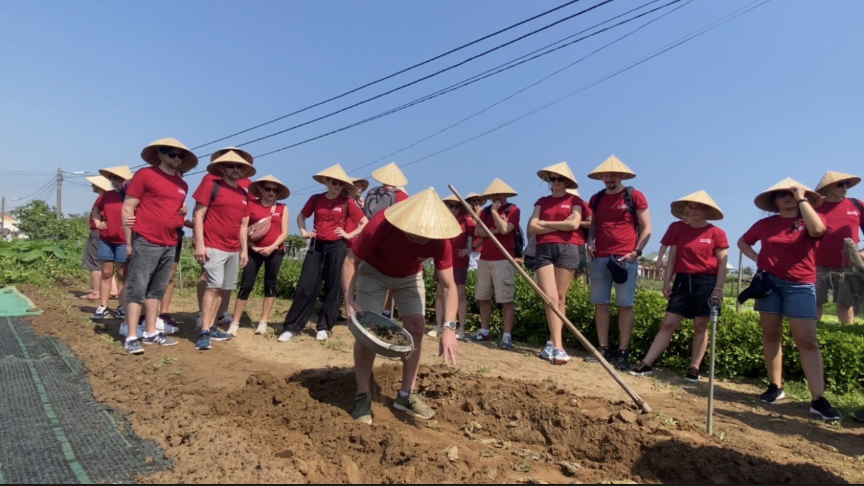 Du khách trải nghiệm trồng rau tại làng rau Trà Quế. Ảnh: V.L
