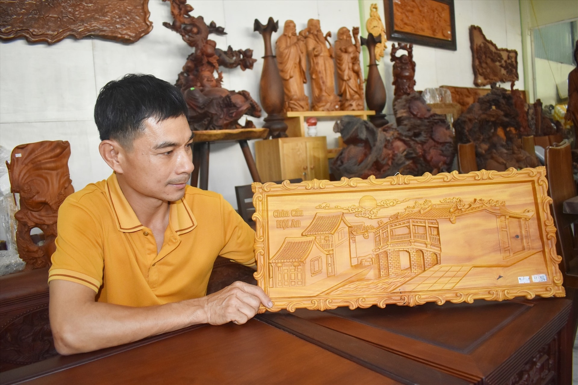 Ông Võ Đức Thi - chủ cơ sở mộc truyền thống ở Kim Bồng (xã Cẩm Kim, TP.Hội An) cho hay, cơ sở của ông sản xuất các mặt hàng thủ công mỹ nghệ từ gỗ các loại như dó bầu, mít, sến để tạo ra các sản phẩm như tượng, tranh, bài vị để bán cho khách du lịch.