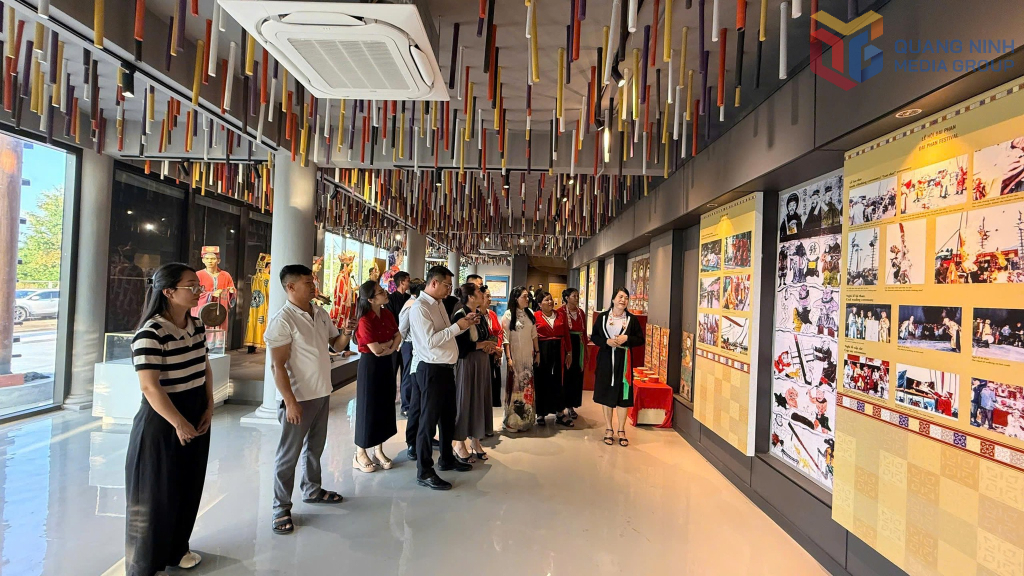 Du khách xem hình ảnh số hóa tại Làng văn hóa du lịch cộng đồng dân tộc Sán Dìu.