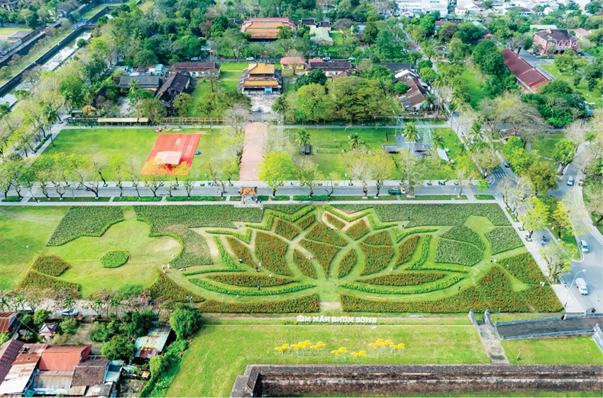 Những ngày đầu tháng 2, sân Hàm Nghi (khu vực Kinh thành Huế) nhộn nhịp hơn thường lệ. Giữa không gian cổ kính, một đóa hoa sen khổng lồ bung nở đầy ấn tượng đã thu hút đông đảo người dân đến tham quan, chụp ảnh lưu niệm. Đóa sen được tạo hình từ 50.000 chậu hoa xuân, được sắp đặt công phu, từng lớp cánh vươn lên tạo nên hiệu ứng thị giác mạnh mẽ. Chị Ngô Thị Huyền, người dân phường Thuận Hóa đã cùng bạn bè đến check-in tại khu vực này: “Tôi lướt facebook thì thấy nhiều fanpage đăng hình hoa tại sân Hàm Nghi rất đẹp nên đã tranh thủ cùng bạn bè đến chụp ảnh. Sắc hoa rực rỡ khiến tôi cảm nhận không khí Tết đang đến rất gần. Loài hoa sen được lựa chọn để làm đại cảnh cũng như một lời chào xuân vừa truyền thống, vừa hiện đại của Huế”.
