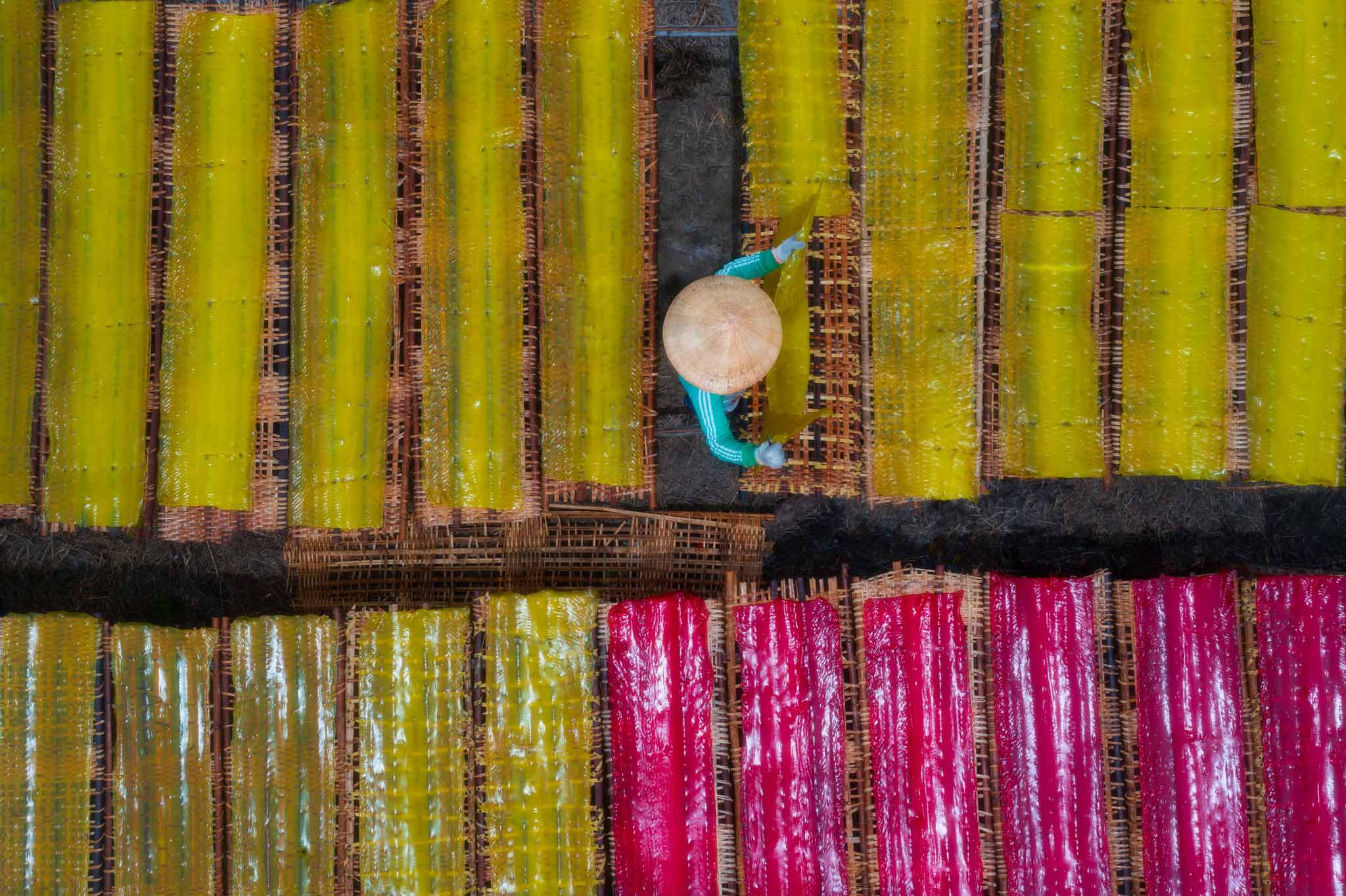 Qua góc máy từ trên cao của nhiếp ảnh gia Trần Tiến Dũng, làng nghề làm bột khoai truyền thống tại xã Long Thành Nam, thị xã Hòa Thành, Tây Ninh hiện lên sống động, đầy sắc màu. Ảnh: Trần Tiến Dũng