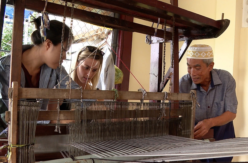Du khách nước ngoài trải nghiệm nghề dệt thổ cẩm của đồng bào Chăm.