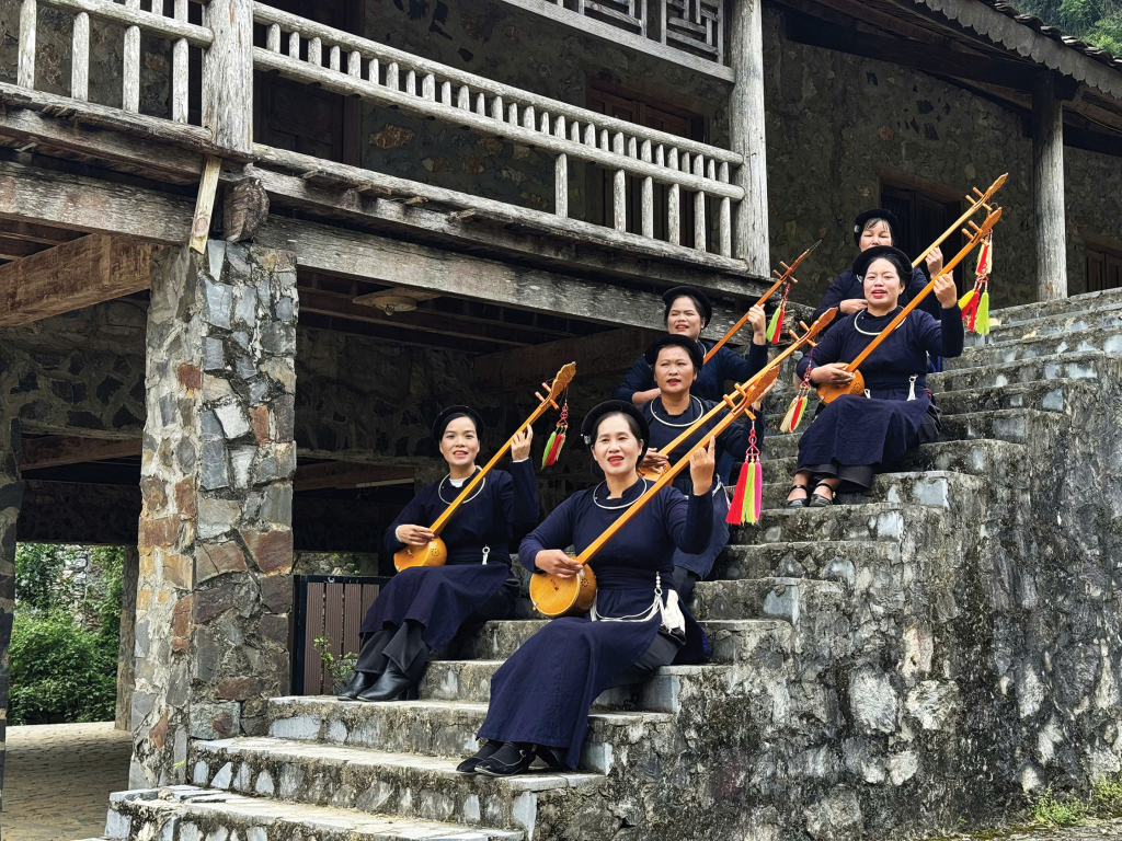 Trải nghiệm văn hóa địa phương với tiết mục đàn tính truyền thống tại điểm du lịch làng đá Khuổi Ky, xã Đàm Thủy.